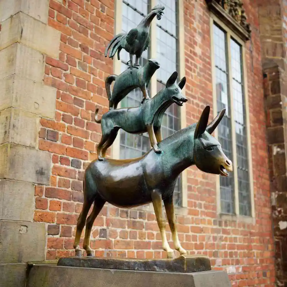 La Estatua de los Músicos de Brema: Inspirada en el cuento de los Hermanos Grimm, esta escultura es un emblema de la ciudad. Consejo: Tómate una foto tocando las patas delanteras del burro para buena suerte.